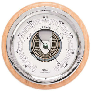 This beautiful Ash and chrome barometer & Tide Clock has a modern feel. It has been lovingly engineered to perfection in Germany by Fischer. The face clearly indicates which direction the weather is going to go on any given day, from rain to shine, depending on the barometric pressure in the air.